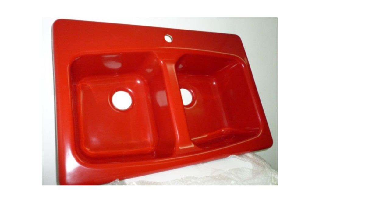 Lavaplatos para cocina doble tina en fibra de vidrio color rojo. Medidas generales 83 x 55 cms.